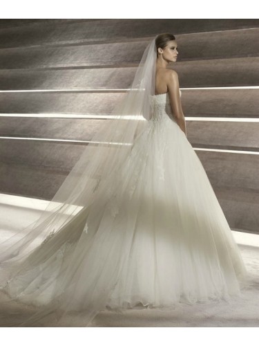 Specials: Tulle Strapless Straight Neckline with Lace Bustand Boned Lace Midriff. Draped Skirt with Lace Applique Accents,Chapel Train
