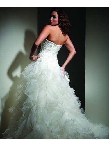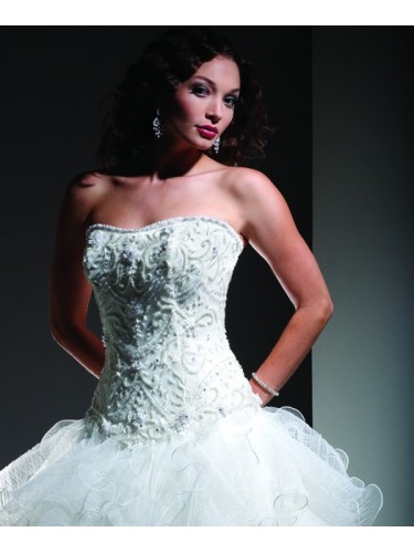 Strapless ball gown with a soft sweetheart neckline outlined with beads. The laced bodice is covered with an ornate embroidered and beaded overlay. The ball gown skirt is full of scrolling layers of tulle.