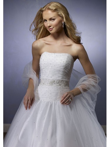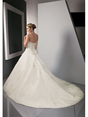 Beaded embroidery on the strapless Bodice with asymmetrically draped waistline. Embroidery edges the front overskirt on the tulle ball gown with the corset tie back meeting the chapel length train