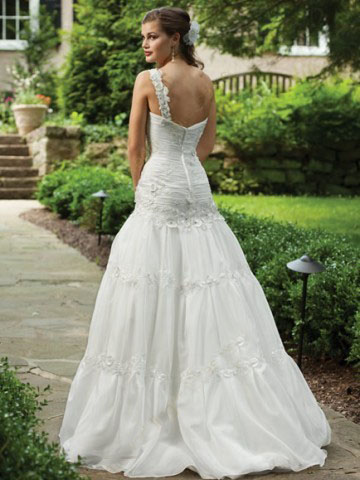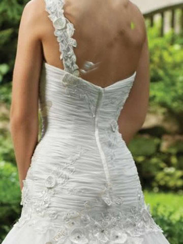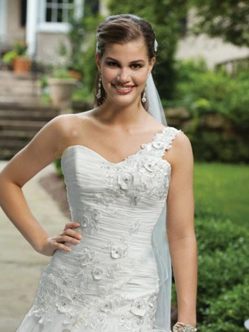 It has a sweetheart neckline with an asymmetrical shoulder strap accented with flower decoration.