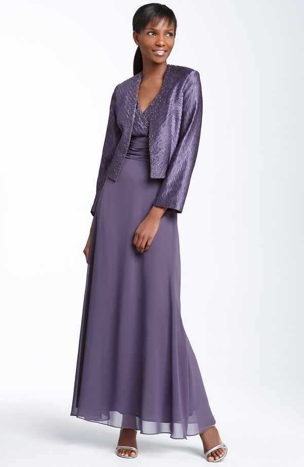 Tonal beading highlights the edges of a chevron-patterned jacket worn over a sleeveless gown with a matching surplice bodice. Ruched waistband and a fluid chiffon skirt play up the hourglass silhouette.