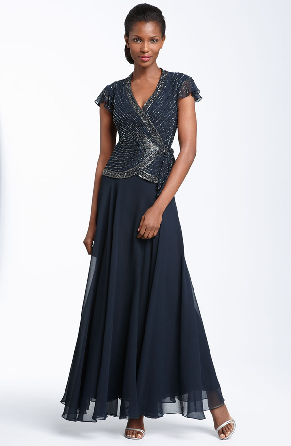 Irridescent beading highlights the faux-wrap front bodice of an elegant chiffon gown with the look of two pieces and the ease of one. Fluttery cap sleeves balance the flowing A-line skirt.