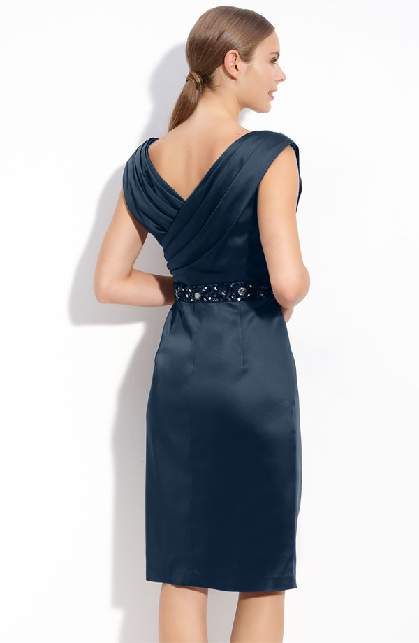 A beaded and sequined waist gathers the draped skirt of a luminous stretch satin dress with a pleated surplice V-neck bodice.