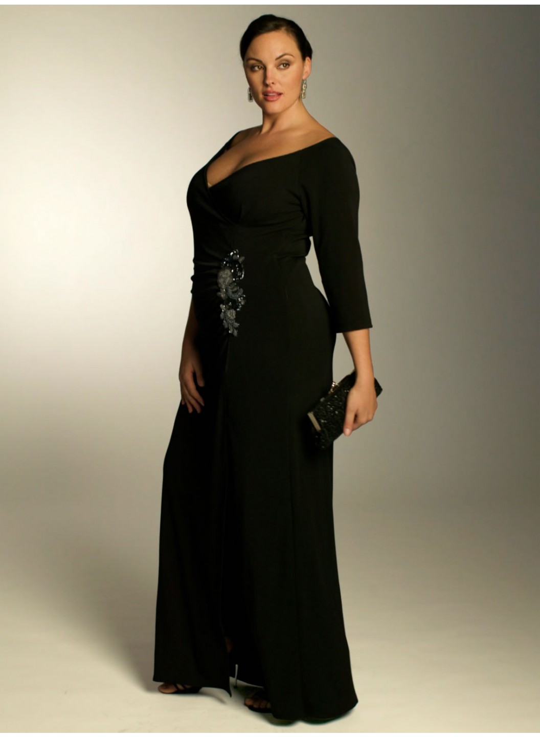 Care: Dry Clean Only Wide faux-wrap plunging necklineDraped torso ends with high slit and a beaded motifStraight skirt falls below the ankles3/4 Length sleevesPartially lined