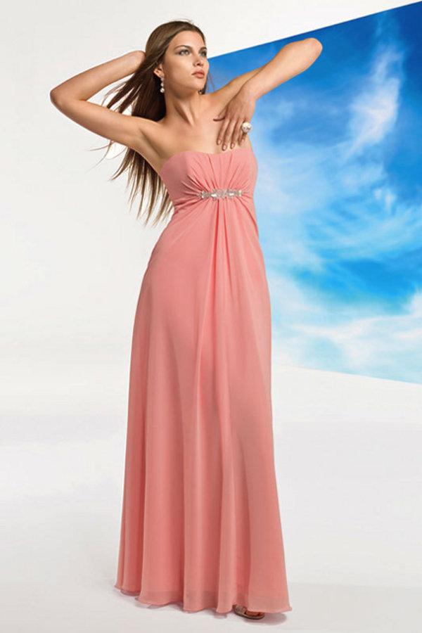 Chiffon Strapless curved sweetheart neckline with molded bustline. Ruched bust into beaded empire waist.