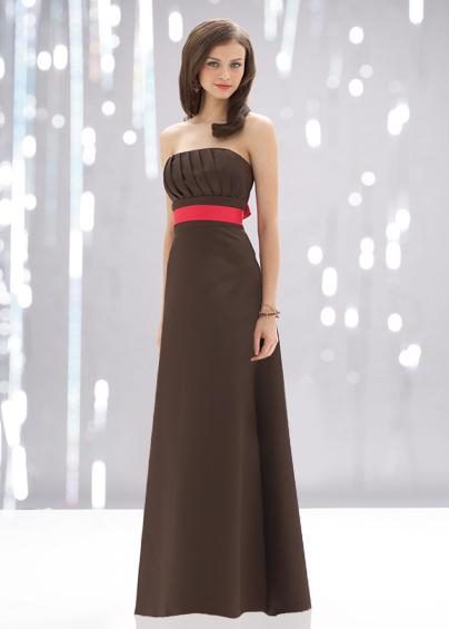 Cognac duchess satin strapless dress with diagonal pleated bodice and chile self sash at waist.