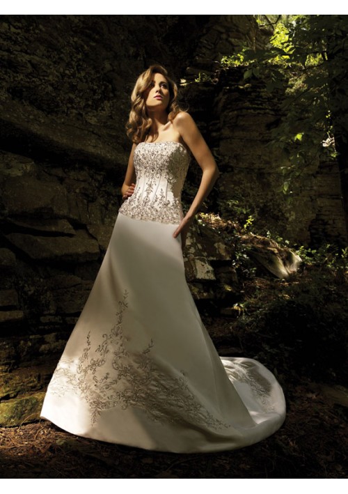This Soft Satin Strapless A-Line Ball Gown Embroidery Throughout With Crystals And Beads Chapel Train Wedding Dress (BOTS1285) is absolutely stunning and luxurious! The embroidery, crystals and beads are exquisite, the satin is smooth and high-quality, and the craftsmanship is flawless. Highly recommended!