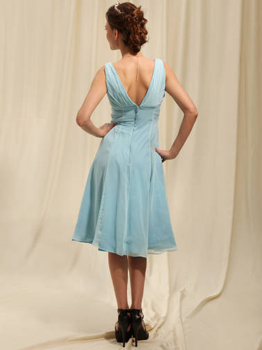• Classic Deep V Neckline Tightly Pleated Knee Length Bridesmaid Dress