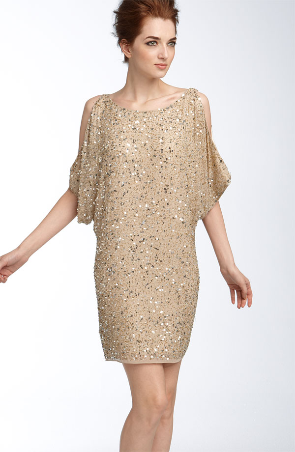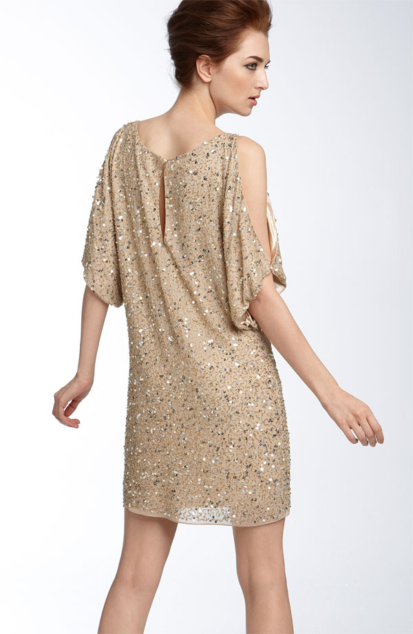 Draped sleeves with dramatically cutout shoulders lead into the loose silhouette of a shimmering sequined dress.