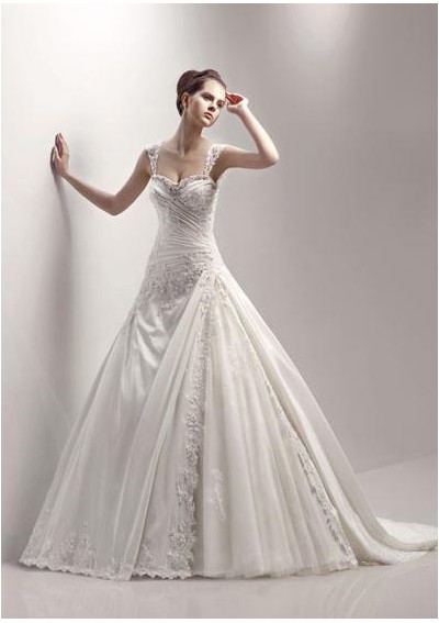 Our fashion style of wedding dress combines all the essence of the traditional beauty and combines the extraordinary modern elements. Fancy silhouette with charming elements creates a fantastic look. Sumptuous wedding dresses appreciate soft neckline dotted with glittering embroidery and beaded motifs over the pleated bodice. Natural waistline reveals the full skirt running down to the floor with a graceful chapel train.