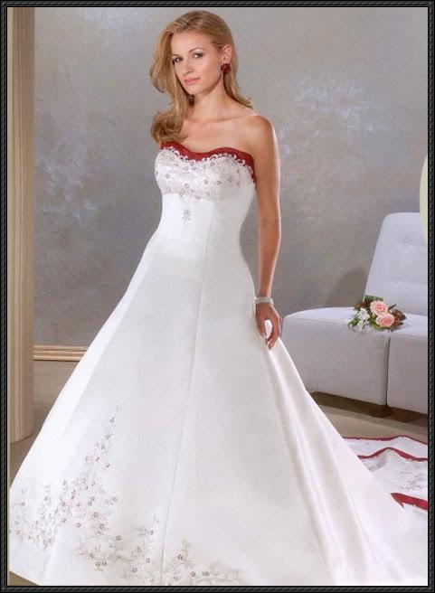 Empire Waist Strapless Red Trim Wedding Dress