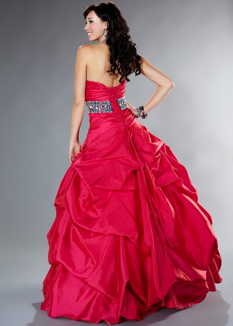 • A-line Taffeta Strapless Pleated Bodice Waistband Lace Up Back floor length Prom Evening Dress