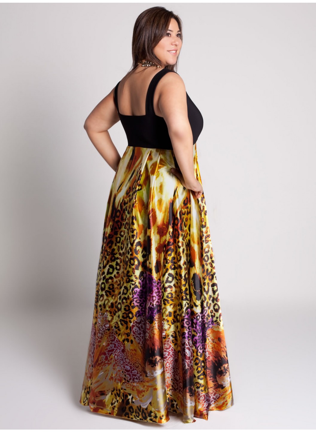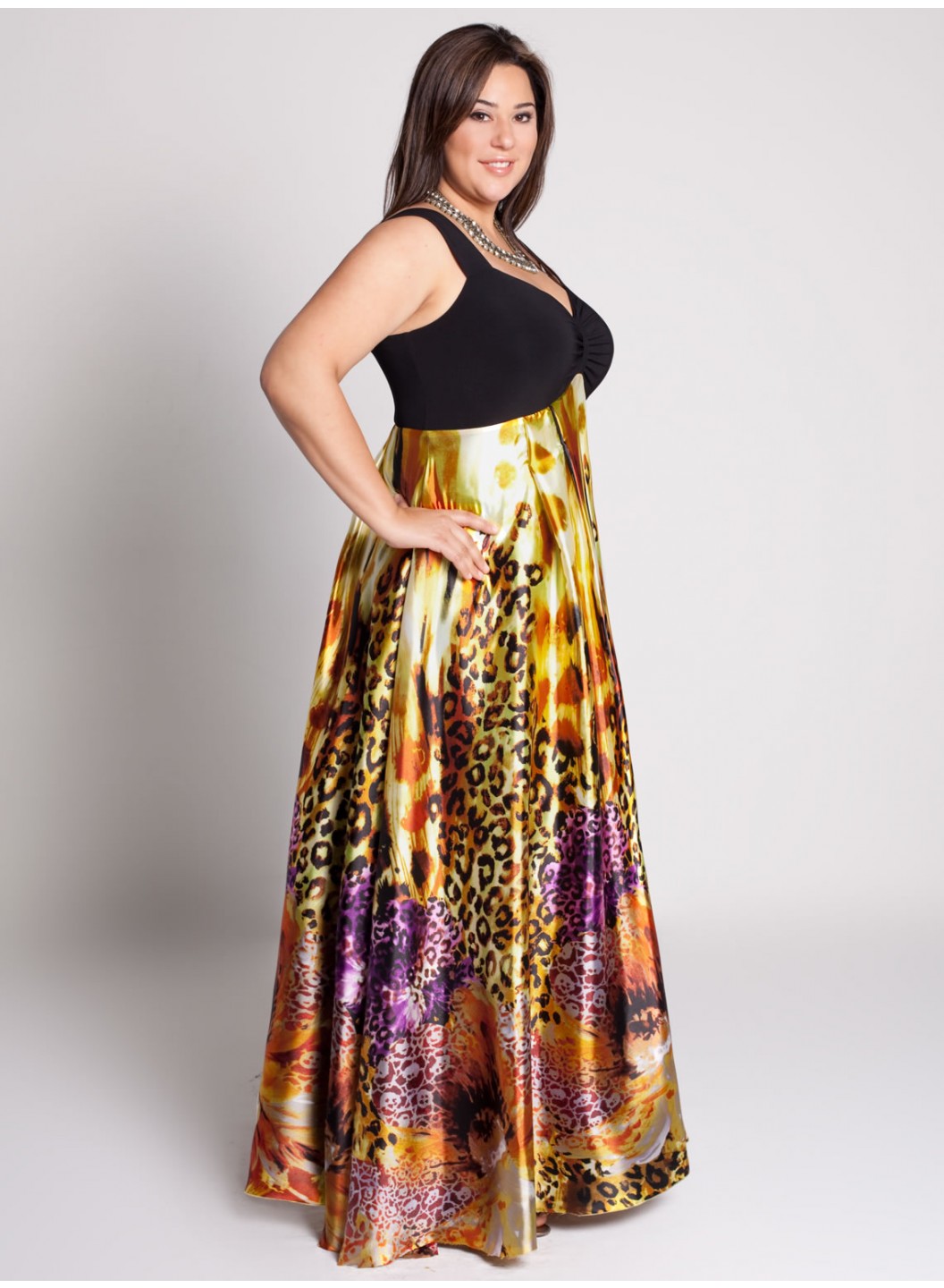 Care: Dry Clean Only Solid black jersey bodice is ruched at the centerWider bra-friendly strapsPeaked empire length abstract printed skirtThe peaked empire lengthens the torso and visuallyflattens the tummy areaSide zipperFully lined