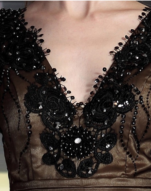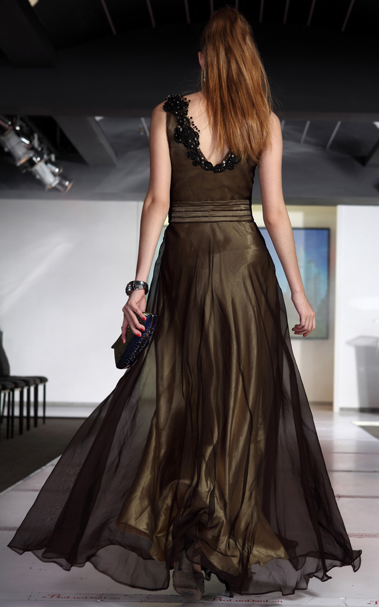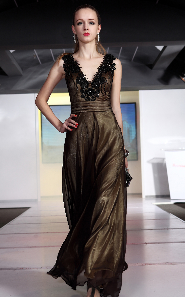 This evening dress is gold underneath, with a light see through black fabric on top. The top is a V-neck cut and is lined with black beads and sequins, which carries over to the back side. Pair this dress up with gold and black accessories such as purse, ear rings, bracelets, and a necklace.