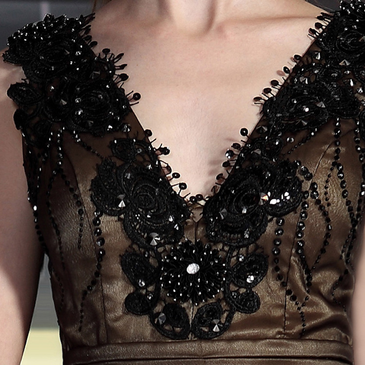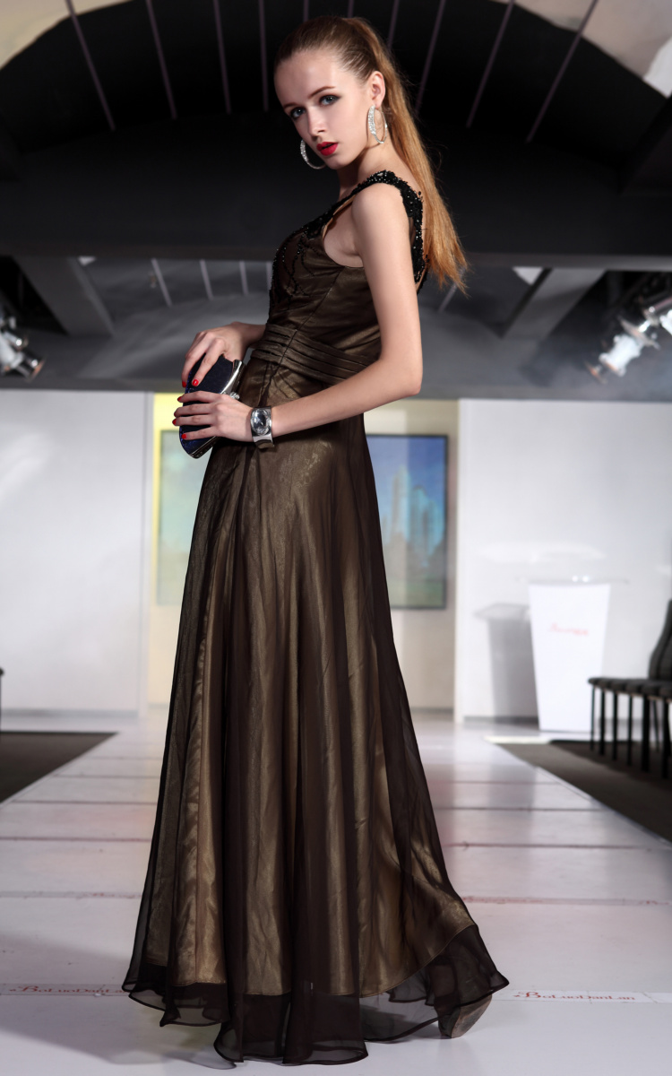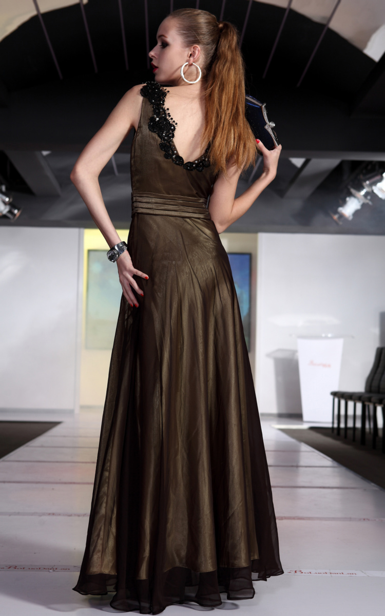 This evening dress is gold underneath, with a light see through black fabric on top. The top is a V-neck cut and is lined with black beads and sequins, which carries over to the back side. Pair this dress up with gold and black accessories such as purse, ear rings, bracelets, and a necklace.