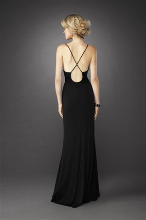 This eye-catching, elegant black evening gown is perfect for any formal party. Be the center of attention in this sexy, sophisticated black evening gown. Slender spaghetti straps hold up fitted v-neck bodice. Down the center of the fitted bodice is a thick row of glittering, dramatic rhinestones that run horizontally from between your breasts to your lower stomach. The fitted waist and hips flow past your thighs at the skirt flares out from your knees to the floor. The rear view features criss crossed rhinestone straps to accentuate your back.