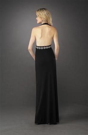 This beautiful black evening gown is incredibly eye-catching, stylish and sexy. Whether you are going to an elegant evening affair or for a night on the town, you will attract a great deal of attention when you wear this gorgeous black evening gown. The halter neckline goes into fitted, v-neck bodice. Beneath your breasts, the bodice ends with a line of dazzling rhinestones set on sensual, revealing strip of black mesh material. From the waistline, the gown fluidly flows to the floor. On the front of the gown to one side is an alluring slit cut to the mid thigh to reveal a delightful bit of leg. The backless rear view is defined by a line of rhinestones above your buttocks.