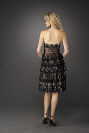 This sexy little black/nude cocktail dress is a real head turner at fine dinners, private parties and elegant events. Made of delicate mesh and lace, this strapless cocktail dress shows off your shoulders and accentuates your bodice with scalloped black lace. The fitted, lacy bodice has a wide band shirred waist to define your figure and a beautifully tiered, full black lace ruffled skirt that sensually ripples down to your knees. Best of all, when you turn around this incredible little black/nude cocktail dress is backless for extra allure.