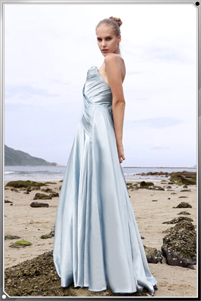 Tradition meets couture with this upscale satin bridesmaid dresses boldly tucked with layers of sculpted satin. The top is especially designed to suit a bridal party where bust sizes range from small to large, flattering everyone. This pearly blue long gown also works nicely as a prom dress or quinceanera dress.