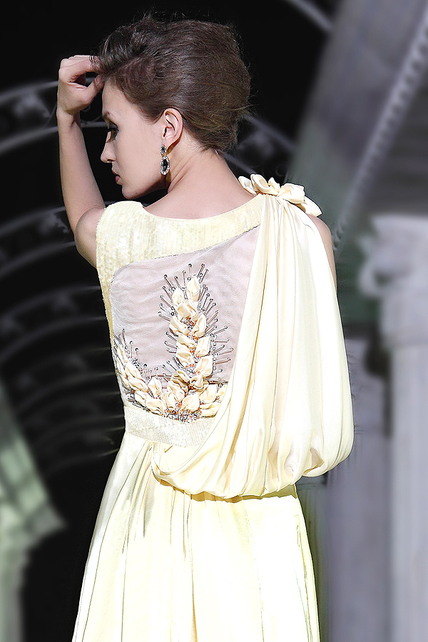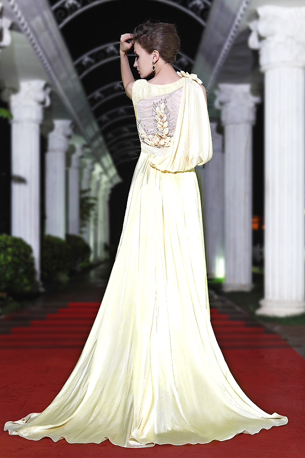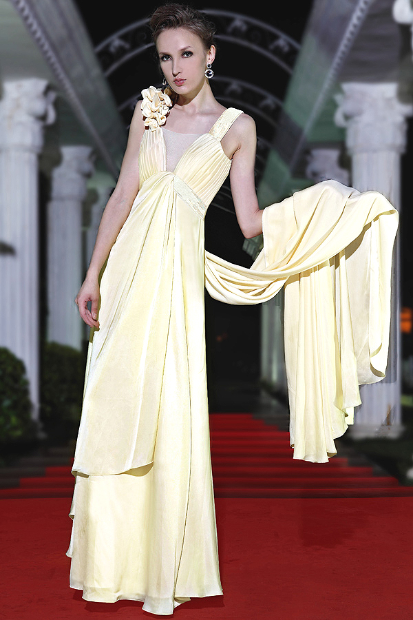 This dress is casual yet reflects a bit of celebrity chic with its floral shoulder and V-front panel. The wrapped layers flow with elegance and grace as you walk the red carpet or swirl and twirl on the dance floor. This evening gown is a great choice for many types of occasions.