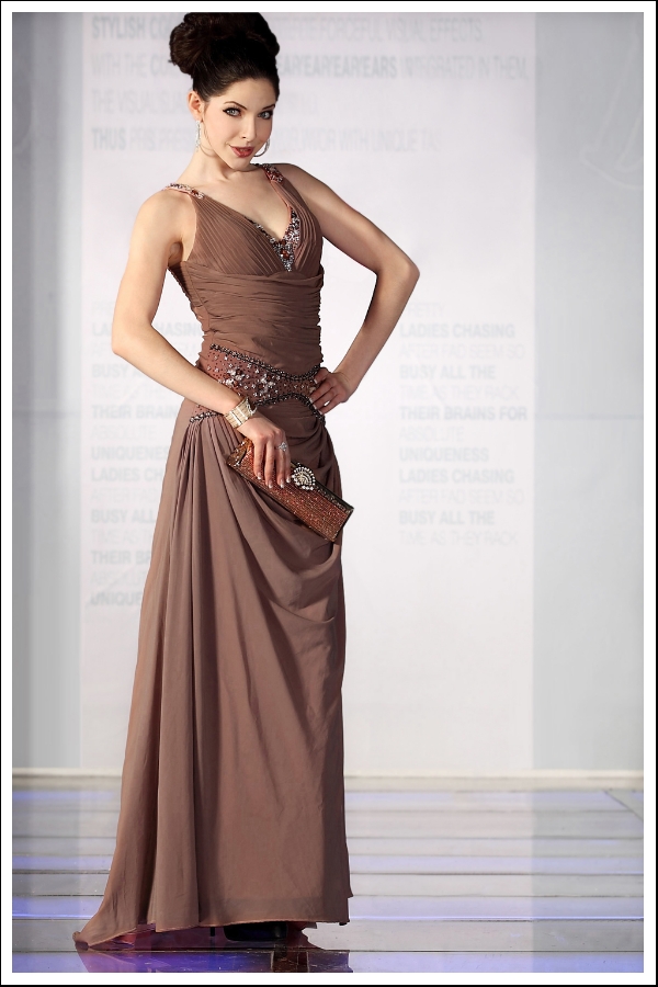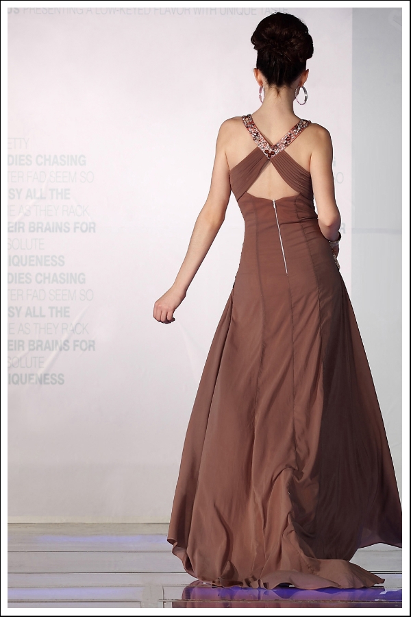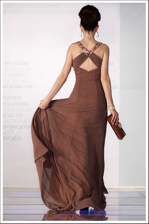Brandish your beauty in this daring coffee-colored cocktail gown. The dress looks especially alluring on women with olive and tan skin tones, and smooths and hugs curves in a sexy, feminine way without compromising a formal look.