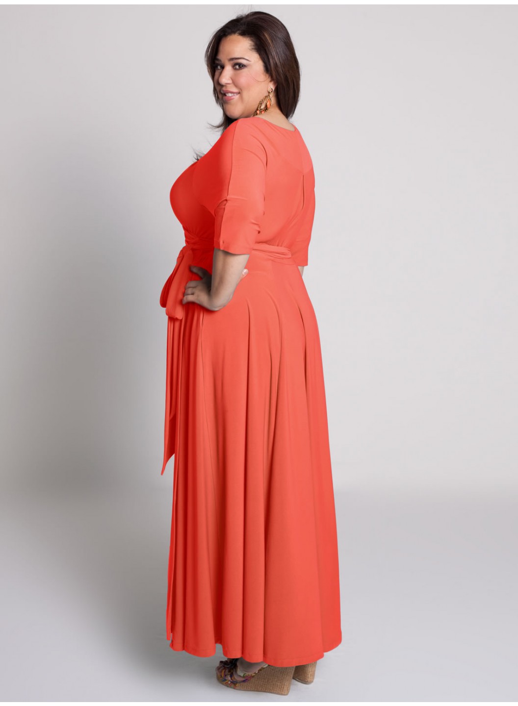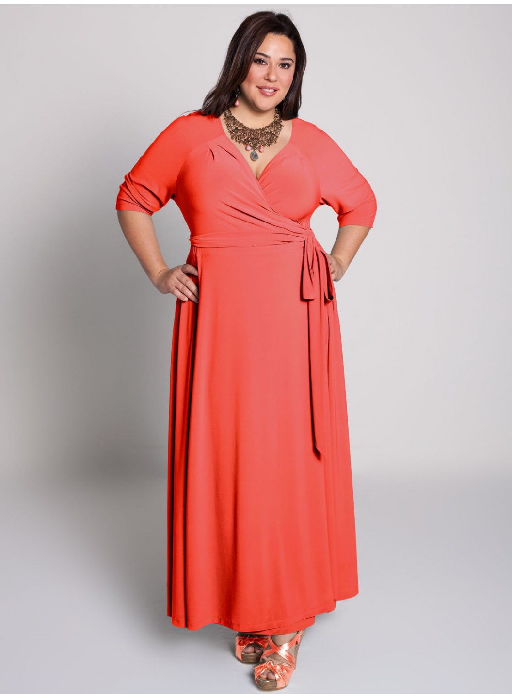 Care: Hand Wash in Cold Water or Dry Clean Surplice bodice is shaped by pleatsRaglan 3/4 length sleevesSet-in waistband can be adjustedTrue wrap-around silhouetteA-line flared skirtSide seam pockets