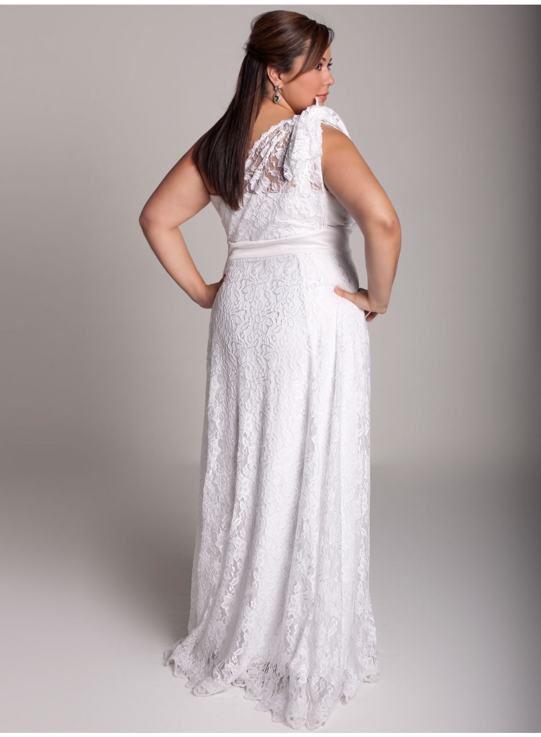 Care: Dry Clean Only One-shoulder silhouette with adjustable tieEmbroidered floral lace has a tad of stretchDetachable crystal embellished beltA-line princess seamed floor length skirtSkirt is trimmed with beaded scalloped laceFully lined