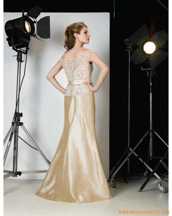 Champaghe evening dress features off-the-shoulder design. Luxury lace covers on the entire bodice with satin sash embellishment. Sheath silhouetted evening dress is floor length and is made of saitn. Made-to-measurement service is offered.