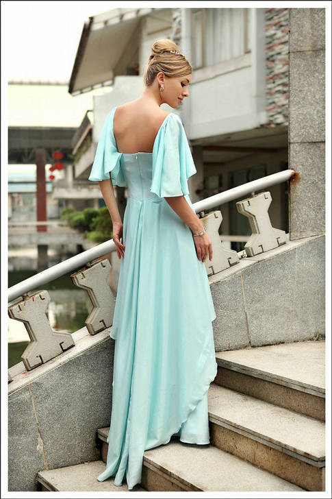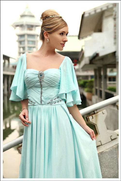 This half-sleeved ball gown is a must for ladies who insist upon being the belle of the ball. Inspired by fairy-tale and renaissance tradition, the sweetheart neckline is paired with elaborate embellishments on a form-fitting bodice with natural waistline. Flowing layers the color of a sea-misted sky complete the look that whispers princess.