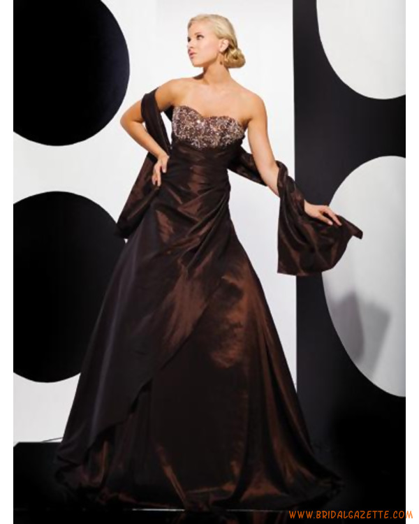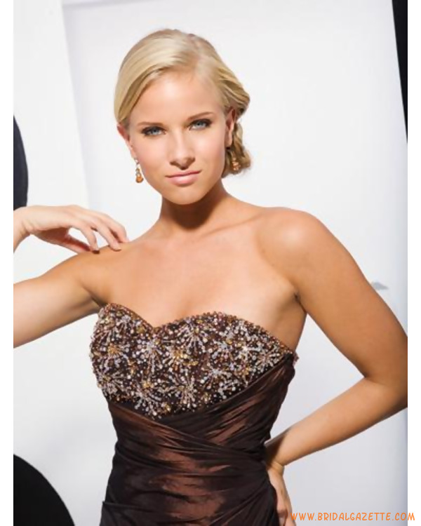 Coffee evening dress features strapless and sweetheart design. Luxury beading adorn on the entire bust part, dazzling. A-line silhouetted evening dress is made of taffeta with zipper closure. Made-to-measurement service is offered.
