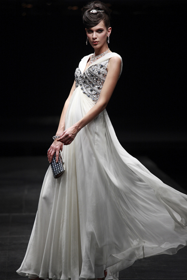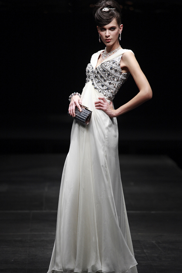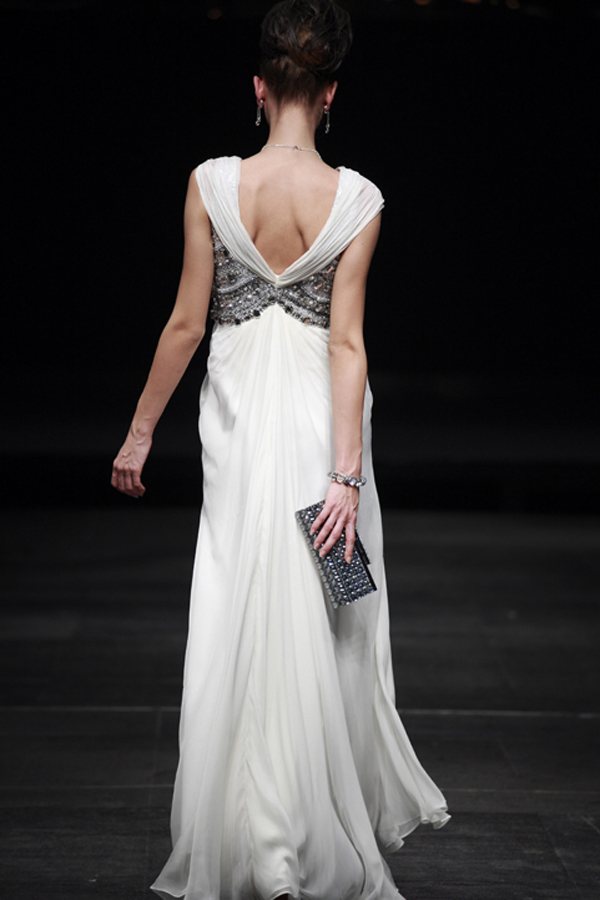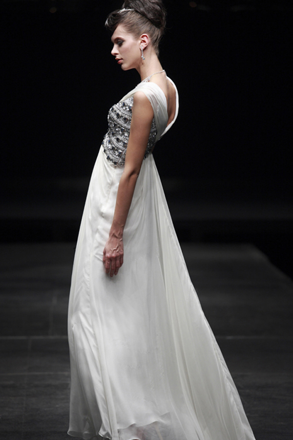 Dazzle everyone on your big day with this top-of-the-line embellished jewel bridal gown. High in class and taste, the modest layers cover the shoulders while jewels accent the bust. Flowing layers of silky fabric spill down all the way to the floor for a dramatic look on this elegant bridal gown.