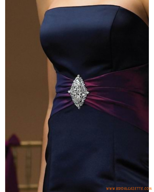 Deep blue evening dress features strapless design. Sheath column silhouetted evening dress is slim. Made of taffeta. Beading embellished on the dark red sash. Made-to-measurement service is offered.