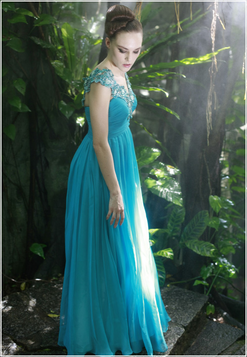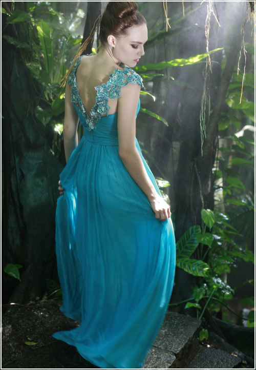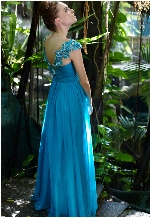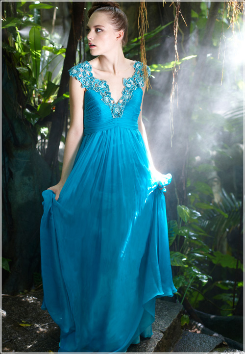 This silk evening gown flatters the body like a perfectly picked bouquet. With a form fitting bodice and floor length flowing skirt, the overall effect is delectable. Finish the look with subtle accessories that show off the embroidered flowers along the straps.