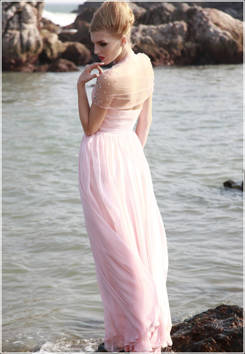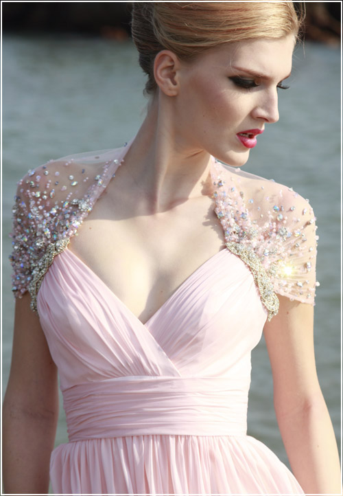 Wow the whole crowd with this Conniefox frosted pink special occasion dress. The cinched material and v-neck bust line all provide very simple yet elegant elements to the dress. Then the sheer, jewel encrusted sleeves and back provide a very unique and gorgeous element to this otherwise slightly simple dress making it the perfect dress for any special occasion.