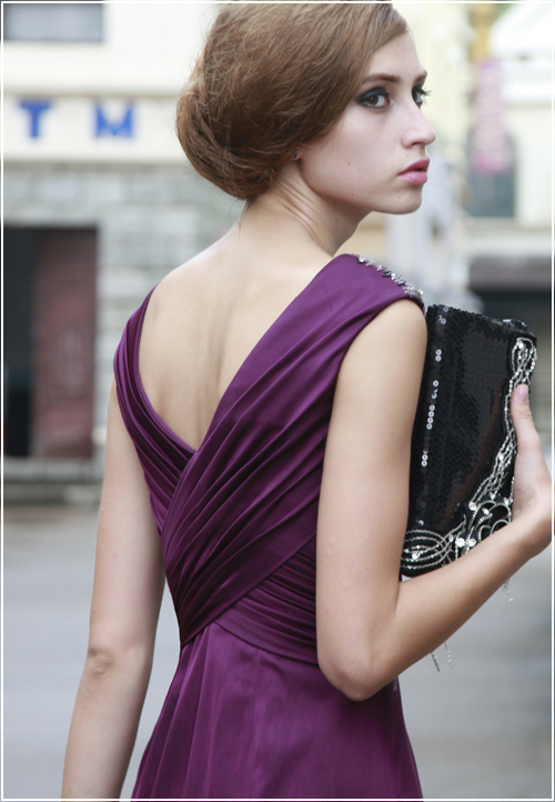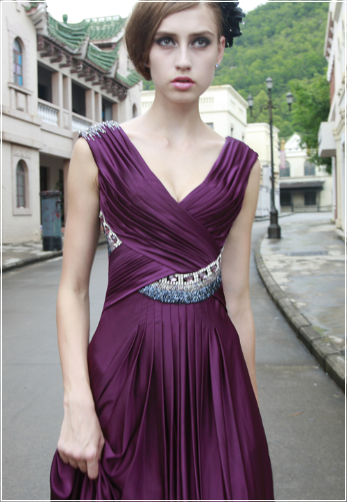 Rich, dark purple layers of wrapped satin are delicately frosted with shiny silver and blue in this couture evening gown design. Great for events such as homecoming, prom, and even as a bridesmaid dress, this evening gown features supportive wide shoulder straps, and plunging front and back lines.