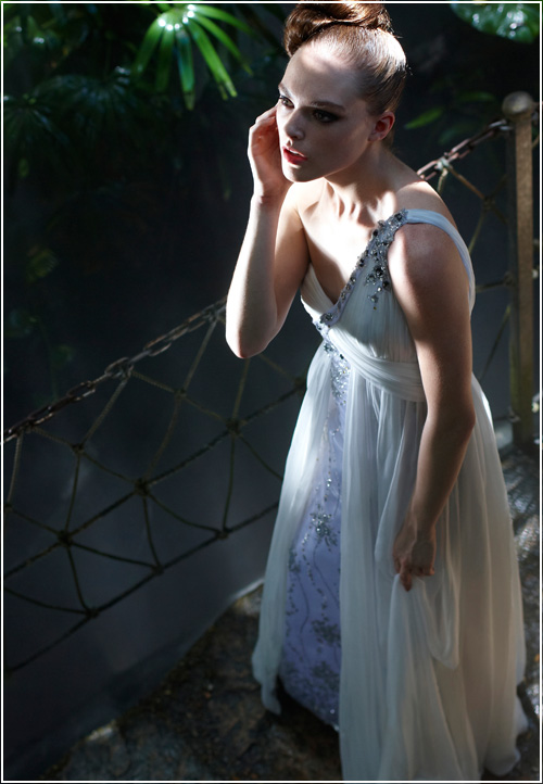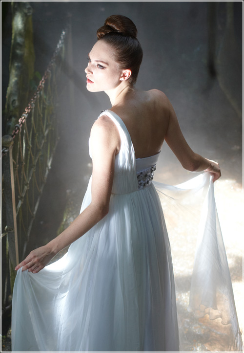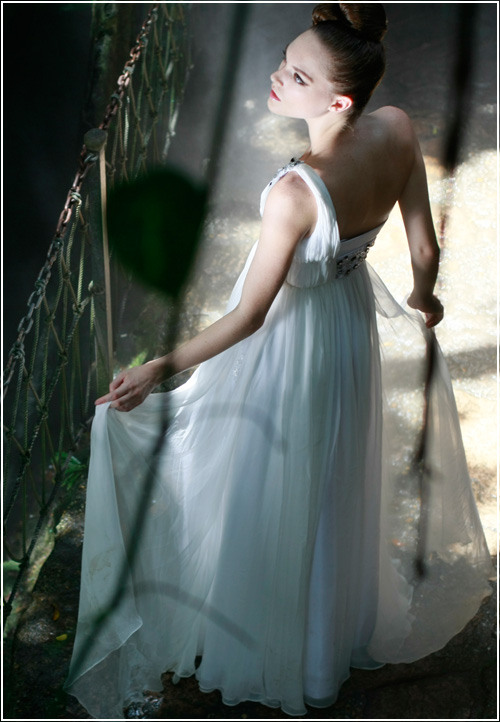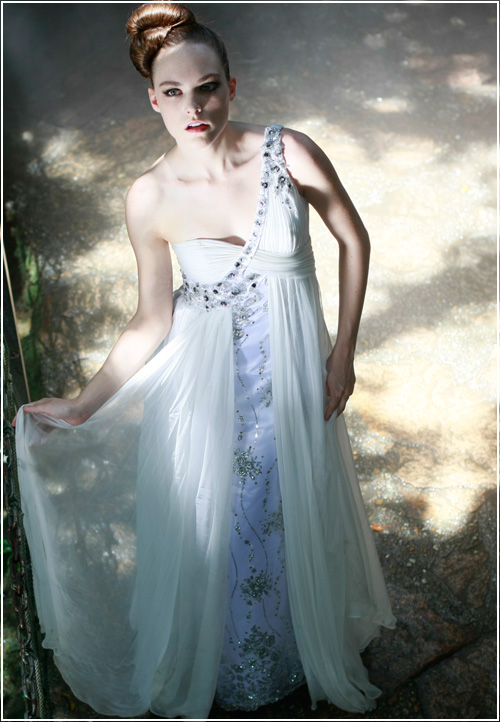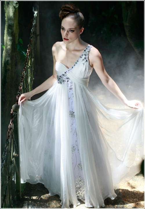 Enter a dream world by slipping on this graceful one shoulder bridal gown. Constructed with delicate silk and satin, the gown is layered to reveal a beaded middle. The intricate beading continues up the shoulder and with a strap on the back. Available in white.