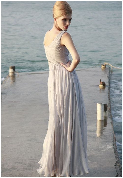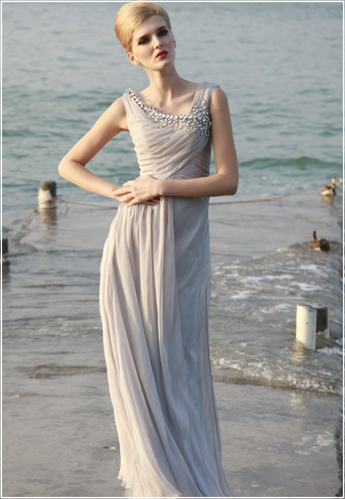 When you want to look beautiful without overdoing it, this grey-beige wrapped evening gown is the answer. The crisp, clean lines of the jeweled square neckline create an even more elegant look on this primly elegant dress. Together the wrapped texture of the bodice and the ruffled texture of the rest of the dress provide a perfectly beautiful mix.