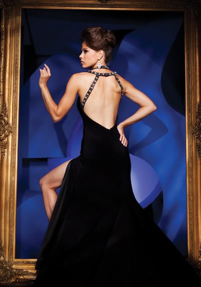• Halter With Beadings V Neckline Furcation Sweep Trsin Backless Black Evening Dress