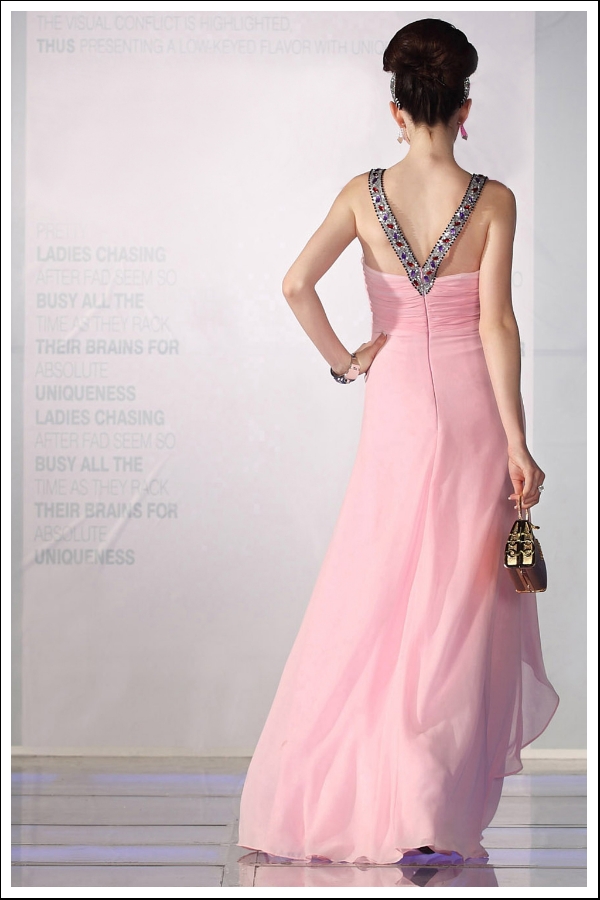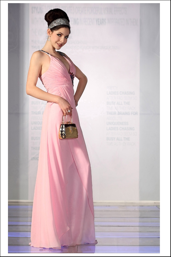 This pink V-neck gown is a great youthful dress with plenty of vibrance. The jeweled flower and straps add just enough accent to this classic gown to render it formal or semiformal. A great choice for many occasions.