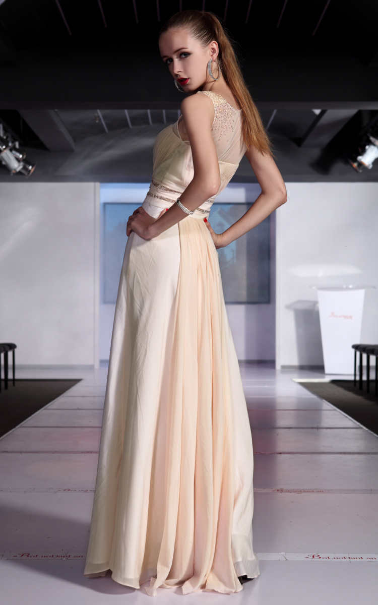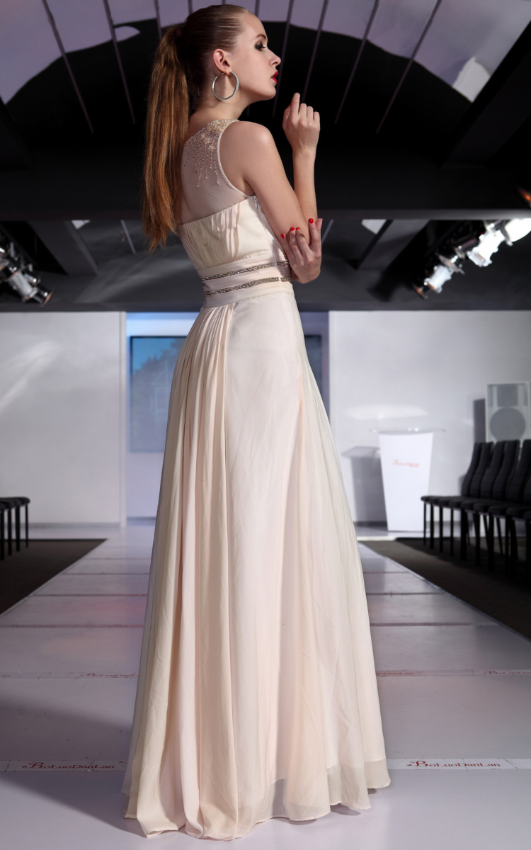 This dress is a very light peach color with silver accents. The dress is a sweetheart neckline, but has a see through mesh fabric giving the dress straps and a more modest look. Silver beads are accenting along the waist, with a large silver design in the middle of the front.