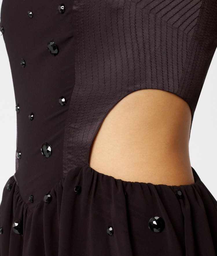 For a LBD with a twist, this prom style dress is sure to make you stand out from the crowd, featuring side cut out panels and jewelled bodice. Dress zips up at back. Wearing length 88cm.