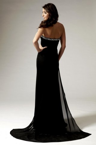 A beautifully elegant full-length strapless dress in chiffon, with a boned bodice and delicately ruched fabric to contour and add detail. The neckline has a cut out notch detail and a gorgeous wide trim embellished with sequins, beads and large crystal stones. The ultra flattering mermaid shape of this dress skims across the hips and flares out into a long train at the back.