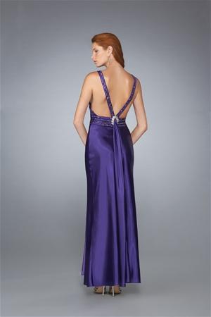 Feel magically royal when you wear this majestic purple formal wear gown to your next formal event. No matter how elegant the affair, you will be the center of attention when you wear this alluring majestic purple formal wear gown. Ample straps uphold the v-neck, fitted bodice of this seductive gown. A line of sparkling rhinestones further defines the bodice and the silky material dangerous curves past your waist and hips then flows fully to the floor. A side slit down the front of this gorgeous gown shows off your leg to the mid-thigh. When you turn around wearing the majestic purple formal wear gown, two thick sparkling straps show off your back beautifully.