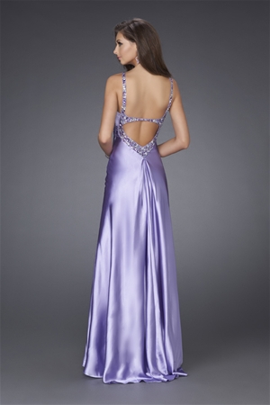 Satin dress with deep v-neckline that is adorned with beading inside the neckline as well as beaded over the shoulder straps. Dip down back.