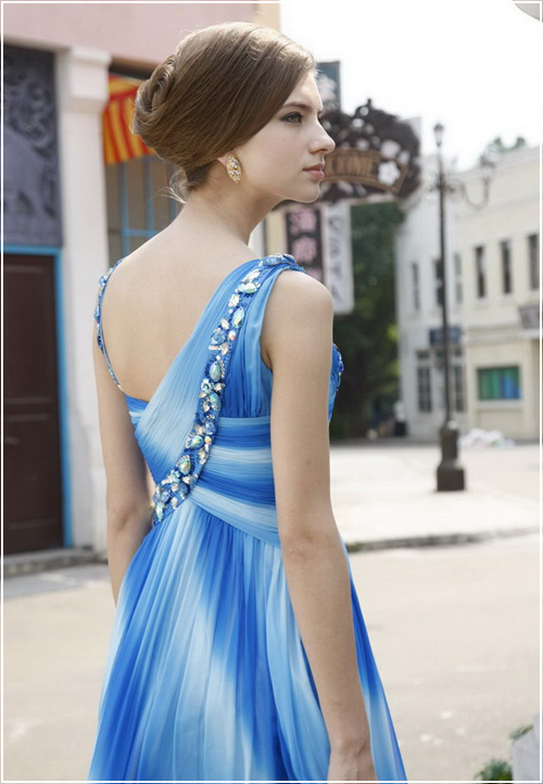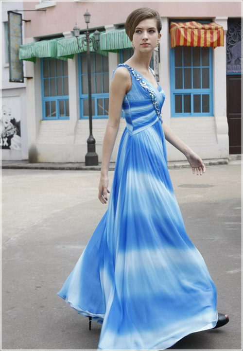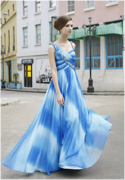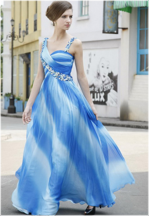 Resemble the tranquil waves wearing this flowing blue evening dress that enthralls and inspires. Simple yet detailed, this gown and its layered chiffon and mesmerizing wave-like stripes make it a stunning choice for evening or formal wear, including pageants or homecoming dances.