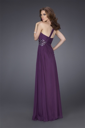 One shoulder elegant gown with fitted rouched bodice and gathered side. The side is adorned with tonal beading.