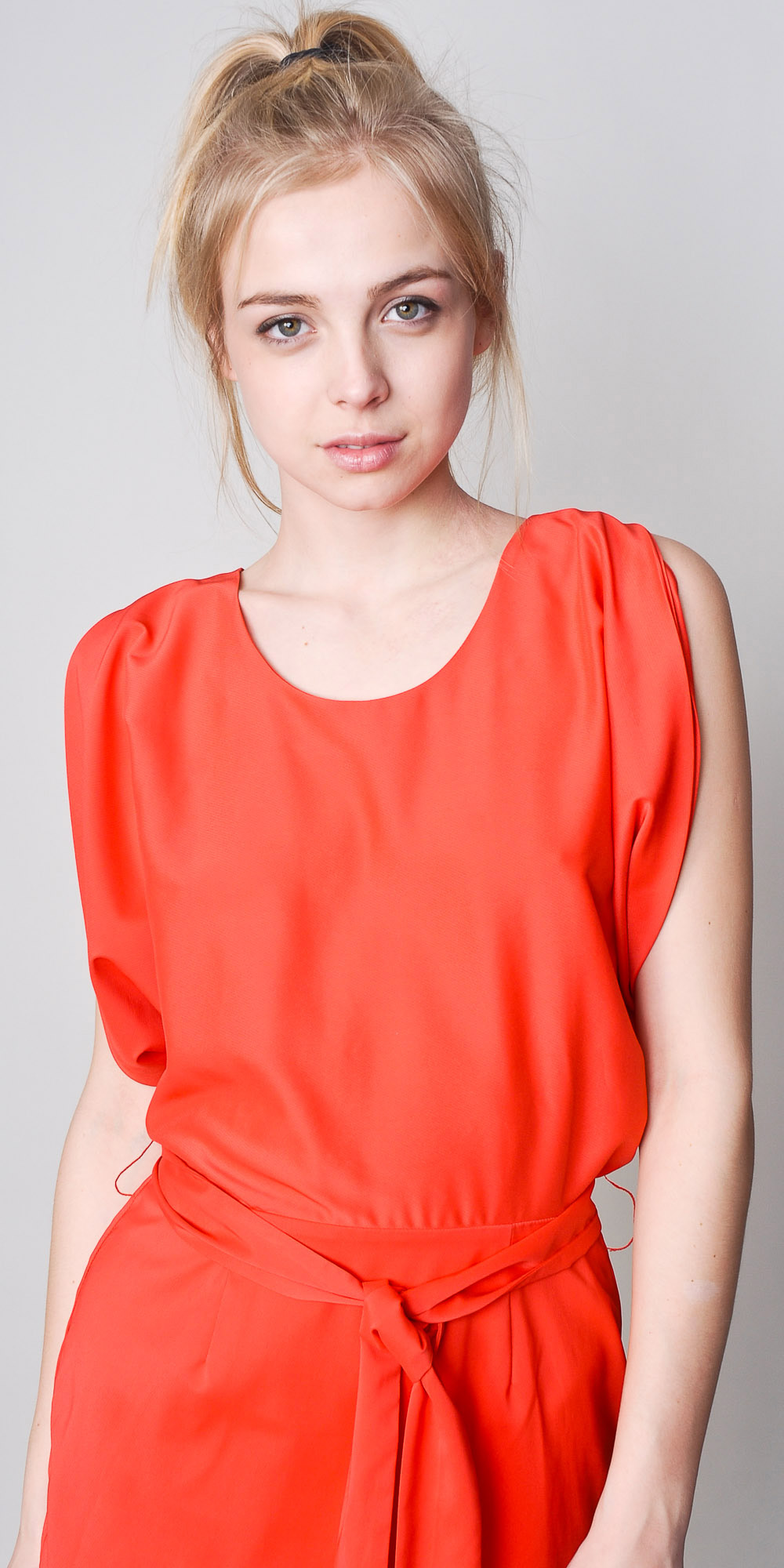 Crew neck; loose fitting bodice with waist sash