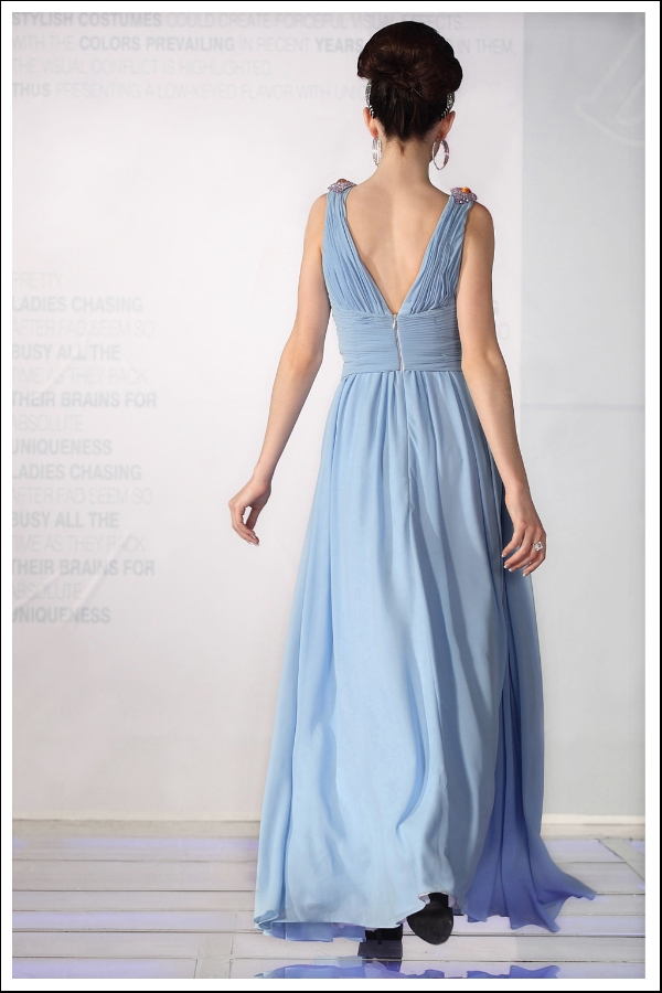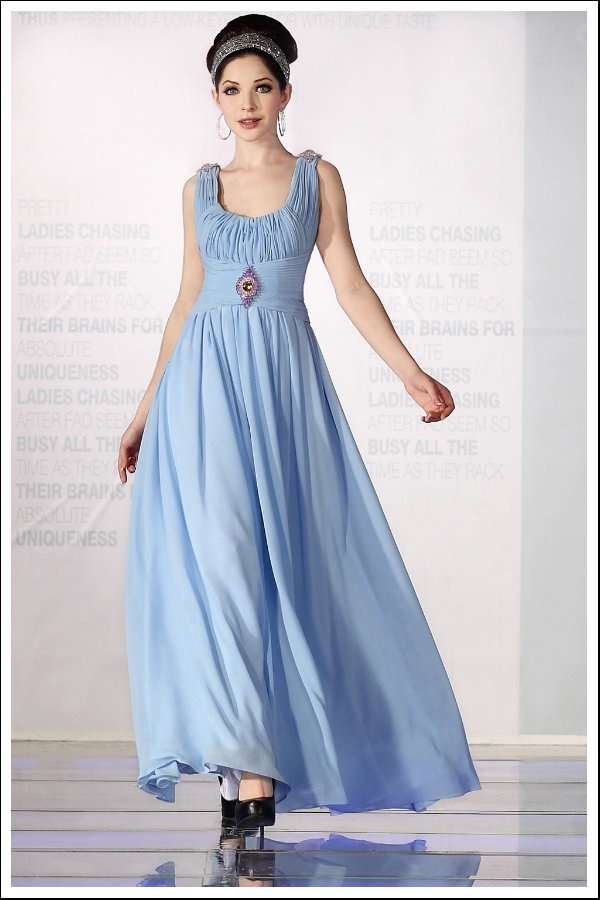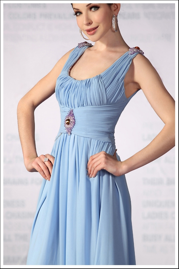 Keep fashion simple with this periwinkle peasant dress. The square-shaped neck allows you to show off muscles, while the empire bust adds support and lift without the cinch of a corset. The waist medallion is simply charming and there's plenty of skirt to hold when you folk dance, curtsey, or twirl carefree.