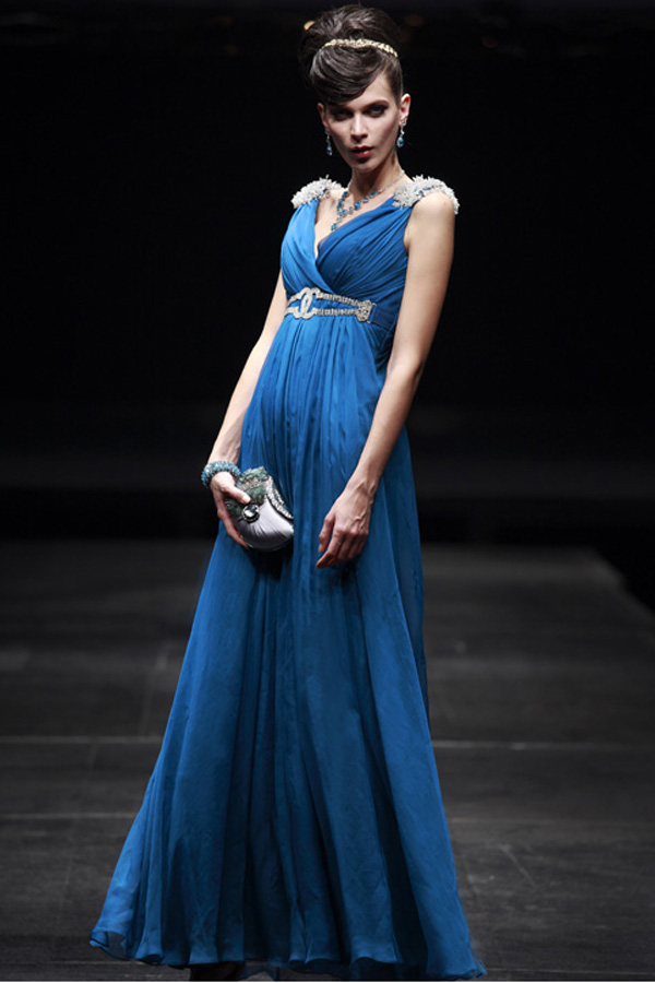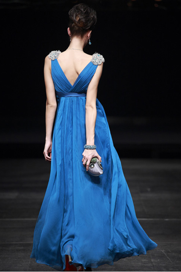 Show your regal side in this royal blue formal evening gown. The shoulders are embellished with fringed fabric, and the silver belted waist resembles the authority of high-ranking official. The comfortable layers are wrapped and flow for ease of movement during your next formal, black-tie, or white-tie gathering.