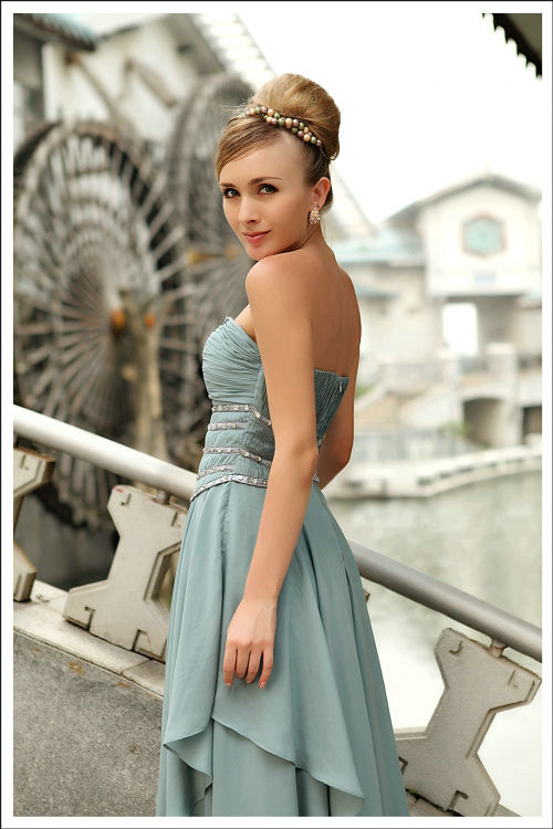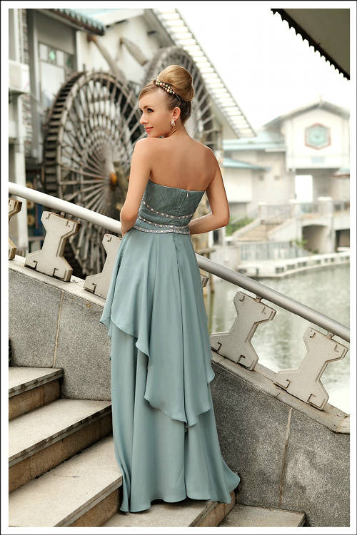 This matte, sage-colored strapless gown features a U-front slit lined with embroidery and amber and golden embellishments. The ruffled layers of composite silk and stretch silk satin give this evening gown a princess look, perfect for balls, proms, homecoming, or as a bridesmaid dress.